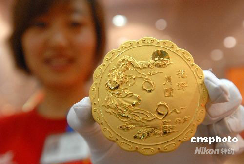 9月3日,遼寧省沈陽市一黃金商店內(nèi),服務(wù)人員展示迎接中秋佳節(jié)的黃金月餅。該月餅用24K黃金制作,售價在10000元左右。中新社發(fā) 孫海 攝