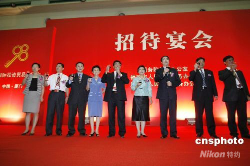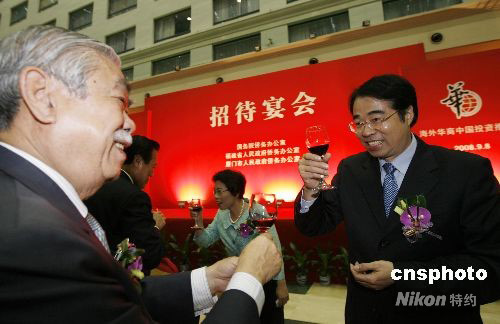 九月八日晚,國(guó)務(wù)院僑辦在廈門(mén)設(shè)宴款待出席“2008海外華商中國(guó)投資推介會(huì)”高端訪談及“改革開(kāi)放三十年僑資企業(yè)成就展”的嘉賓,國(guó)務(wù)院僑辦、福建省僑辦及廈門(mén)市僑辦領(lǐng)導(dǎo)上臺(tái)感謝僑商僑資為祖國(guó)經(jīng)濟(jì)建設(shè)付出的努力。中新社發(fā) 王麗南 攝
