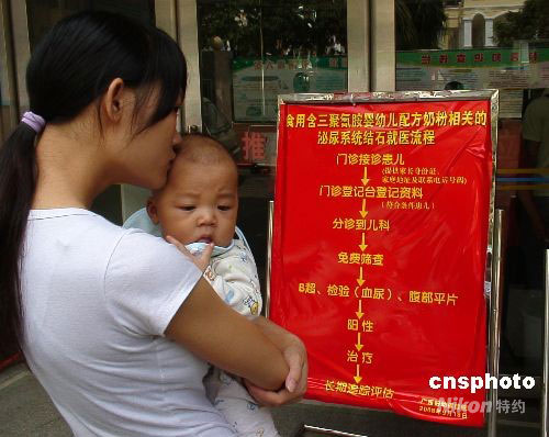 9月19日,廣西婦幼保健院門診樓前,一位母親準(zhǔn)備帶小孩篩查腎結(jié)石。問題奶粉事件在中國各地引起家長們的普遍擔(dān)憂,廣西諸多醫(yī)院紛紛開設(shè)“綠色通道”等便民措施。中新社發(fā) 王剛 攝