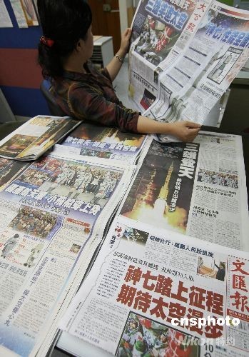 圖:香港各大報(bào)章大幅報(bào)道“神舟七號(hào)”