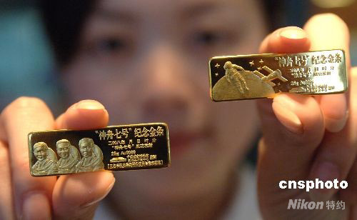 9月26日,為紀(jì)念“神舟七號”飛船發(fā)射成功,由中國國家博物館藝術(shù)品開發(fā)中心監(jiān)制的“神舟七號”紀(jì)念金條在北京上市發(fā)行,發(fā)行前已獲得翟志剛、劉伯明和景海鵬三位宇航員的肖像授權(quán)和簽名。國內(nèi)發(fā)行量限定為3000套,每套包括兩根25克AU9999金條。第一根金條雕鑄有“神舟七號”在太空的遨游圖和宇航員出艙圖;第二根金條正面雕鑄有三名宇航員的肖像。 中新社發(fā) 鄒憲 攝