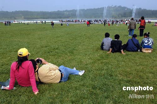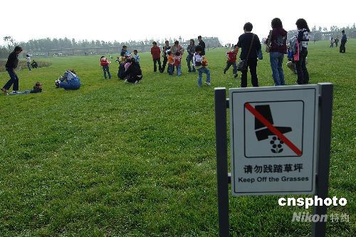 9月29日,北京奧林匹克森林公園露天劇場大草坪被迫準(zhǔn)許游人進(jìn)入休閑,草坪大面積遭到踐踏。北京殘奧會閉幕后,該草坪在禁止游人進(jìn)入時(shí),一直有游客違規(guī)強(qiáng)行進(jìn)入,并不斷與保安人員發(fā)生沖突。鑒于近期警員、保安、志愿者紛紛休假離去,森林公園管理機(jī)構(gòu)正式撤除了草坪阻攔線,默許游人在此行走,滯留。中新社發(fā) 鄒憲 攝