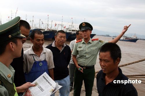 9月30日,邊防官兵在溫州飛云江漁港向待臺風(fēng)“薔薇”警報解除后出海的漁民通報外輪“HELIOS 3”號船在溫州南麂海域沉沒情況,提醒漁船在出海后注意發(fā)現(xiàn)遇險人員及漂浮物。 9月29日下午2時許,在巴拿馬注冊的韓國貨輪“HELIOS 3”號船從緬甸載6000噸原木前往浙江嘉興港,在航經(jīng)溫州南麂島以南約5海里處時,受臺風(fēng)“薔薇”影響,船上貨物移位,造成兩艙進(jìn)水發(fā)生險情后沉沒,船上共有韓國、緬甸、印尼等國家地區(qū)的外籍船員15名。海上搜救部門立即啟動應(yīng)急預(yù)案,當(dāng)晚有2名外籍船員在救生筏上被一艘路過的船舶救起,其余13名遇險外籍船員仍在搜尋之中。中新社發(fā) 蔡寬元 攝