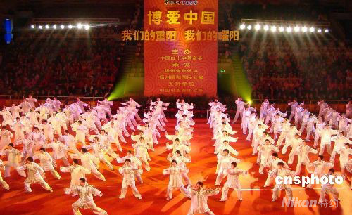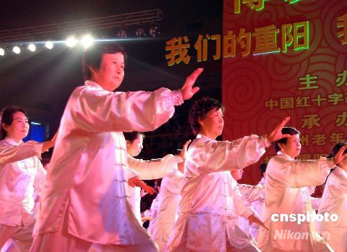 10月6日,揚州150位老人同臺表演太極拳。當(dāng)天,由中國紅十字基金會主辦的“博愛中國•我們的重陽”大聯(lián)歡活動在江蘇揚州市體育場舉行,近千名老年朋友歡聚一堂,表演并觀看精彩紛呈的文藝演出,喜迎重陽節(jié)。 中新社發(fā) 陳中秋 攝