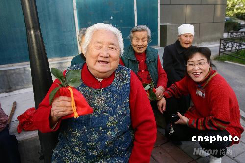 圖:北京社區(qū)老人佩戴茱萸囊歡度重陽(yáng)節(jié)