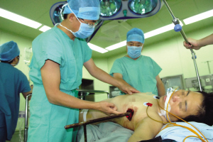 來到醫(yī)院后王女士已經(jīng)出現(xiàn)意識模糊,同時伴有劇烈的胸痛。胸外科主任張臨友教授和副主任徐廣全教授迅速組織相關(guān)科室人員會診,爭取快速摸清患者胸腔內(nèi)的情況和鋼筋對各器官造成的損傷。由于消防隊員在切割鋼筋時怕傷到王女士,所以切割點離傷口較遠,造成留在體外的鋼筋較長,傷者無法進入CT拍攝影像,給診斷帶來了很大的困難。醫(yī)生只得為王女士進行了胸部的X光片檢查。依靠豐富的臨床經(jīng)驗和X光片,醫(yī)生判斷王女士的肺組織已經(jīng)損傷,必須立即開胸探查。