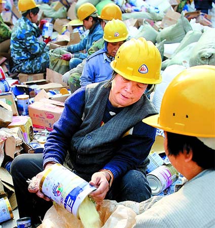 圖為工人將問題奶粉分揀裝袋以便銷毀!逗颖比?qǐng)?bào)》記者 馬建敏、趙永輝攝影報(bào)道
