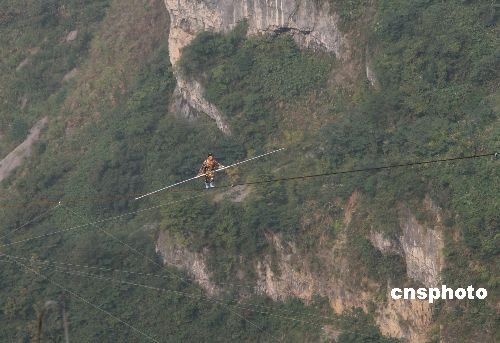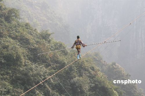 18日,“高空王子”阿迪力的親侄子賽買提·艾江在張家界天門山的萬仞絕壁之間展示了“達(dá)瓦孜”的驚人絕技。雖然賽買提在最后50米處意外“失手”,被救援人員接回終點,但在傾斜達(dá)39度的鋼繩上行走了650米,已經(jīng)成功挑戰(zhàn)了世界最大斜度的高空走鋼絲極限。“達(dá)瓦孜”意思是“高空走繩索”,是新疆維吾爾族歷史悠久的民間傳統(tǒng)絕技。中新社發(fā) 鄧霞 攝