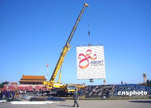 2008年10月27日上午,北京天安門廣場,施工人員開始吊卸第七屆亞歐首腦會議標(biāo)識,整個中心花壇的拆除工作正在加緊進(jìn)行,預(yù)計將于今晚全部拆卸完畢。今年的天安門廣場花壇布置從7月5日開始施工,經(jīng)歷奧運會、殘奧會、國慶、第七屆亞歐首腦會四個時期,至今已歷時3個多月。這是自1986年廣場擺花以來,史無前例的。中新社發(fā) 玉龍 攝