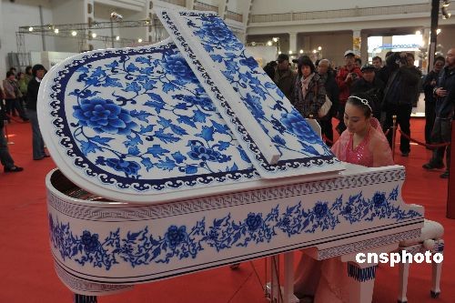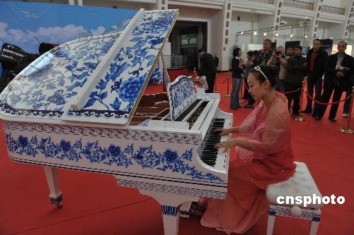 10月28日,在中國(guó)東北亞(沈陽(yáng))進(jìn)口商品博覽會(huì)上,一名少女在彈奏青花瓷鋼琴。現(xiàn)場(chǎng)的工作人員介紹說(shuō),這架名為琴瓷的鋼琴是專(zhuān)門(mén)為前不久舉辦的國(guó)際樂(lè)器展覽會(huì)制作的,琴身上的瓷紋是由技術(shù)人員手工雕刻而成,目前在世界上僅有這一架,市場(chǎng)售價(jià)在46.9萬(wàn)元左右。中新社發(fā) 徐建國(guó) 攝