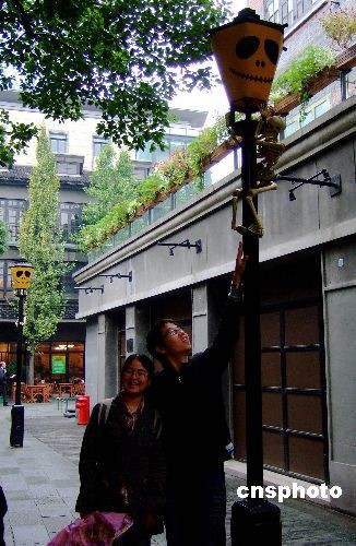 2008年10月29日,為迎接2008萬圣節(jié),上海新天地酒吧街已完成全程置景的設(shè)計布置,以綿延酒吧街?jǐn)?shù)十處的萬圣置景,為游客“講述不怕鬼的故事”。南瓜頭鬼,白骨嶙峋鬼,美女鬼,小丑鬼……在路邊、酒桌上、樹頂、草地里、燈桿上、石庫門陽臺間,夸張得有趣,吸引游人目光。中新社發(fā) 蔣振雄 攝
