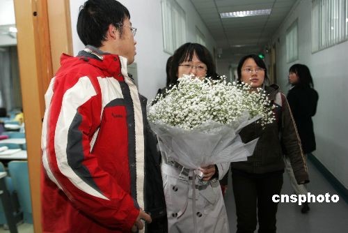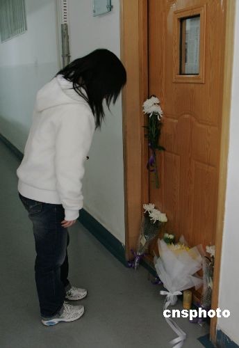 2008年10月29日下午,中國政法大學師生在事發(fā)地點悼念昨日遇害的程春明教授。10月28日晚,中國政法大學昌平校區(qū)內,正準備上課的副教授程春明被一名大四男生砍成重傷,經搶救無效死亡。中新社發(fā) rain 攝