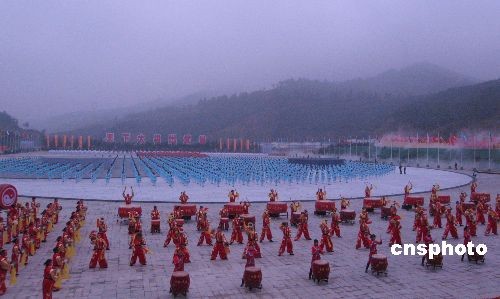 十月三十日,第三屆世界傳統(tǒng)武術(shù)節(jié)舉行“走進(jìn)武當(dāng)”系列活動(dòng),武當(dāng)山舉行萬人太極拳表演,來自全球六十九個(gè)國(guó)家和地區(qū)的一百六十五支代表隊(duì)、兩千多名武術(shù)愛好者共赴這一“武林盛會(huì)”。圖為萬人表演之前的歡迎鑼鼓。中新社發(fā) 艾啟平 攝