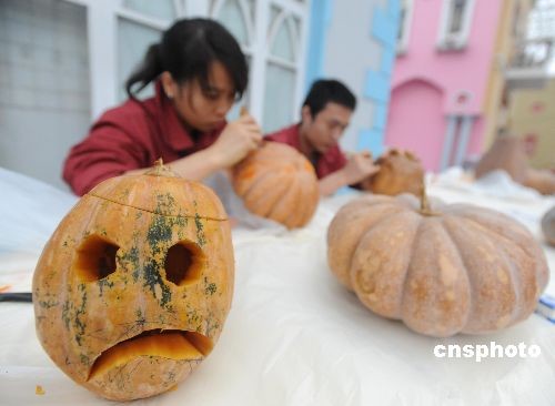 10月31日,是西方傳統(tǒng)的“鬼節(jié)”萬圣節(jié)前夜。白天,下著蒙蒙細雨的長沙處處寒意濃濃,長沙世界之窗工作人員正在雕刻的“毛骨悚然”的各式南瓜,讓這個陰冷的節(jié)日多了幾分“鬼”意。中新社發(fā) 肖前輝 攝