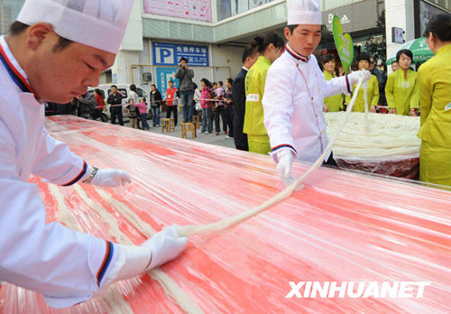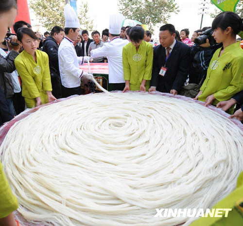 11月2日,一家方便米線生產廠家在鄭州街頭舉行挑戰(zhàn)最長的方便米線活動,商家展示出他們特意加工的一把113根米線,每根長420.4米。