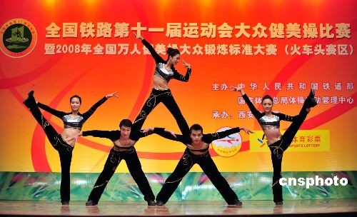 11月2日,全國鐵路第十一屆運(yùn)動(dòng)會(huì)大眾健美操賽在西安開賽,17支代表隊(duì)的173名選手參加了職工大眾組和中年組7個(gè)級(jí)別的比賽。圖為參賽選手在大眾健美操比賽中。中新社發(fā) 唐振江 攝
