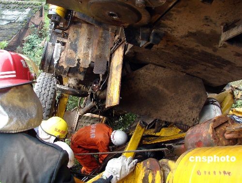 11月2日11時50分許,渝黔高速公路重慶至一品段10公里處,一輛長江牌吊車因爆胎導致車輛失控,沖出護欄發(fā)生側翻,造成1人死亡,1人重傷。圖為消防人員緊急施救。中新社發(fā) 郭晉嘉 攝