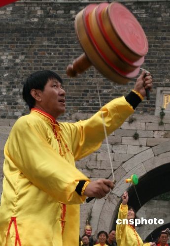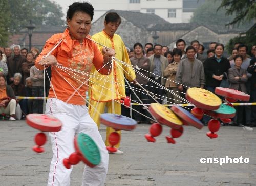 11月6日,在南京中華門城堡廣場(chǎng)舉行的2008中國(guó)南京第二屆民間藝術(shù)節(jié)廣場(chǎng)活動(dòng)上,由南京市空竹協(xié)會(huì)數(shù)十位空竹愛(ài)好者展示的空竹絕技,吸引了眾多市民和游客。中新社發(fā) 鐘山 攝