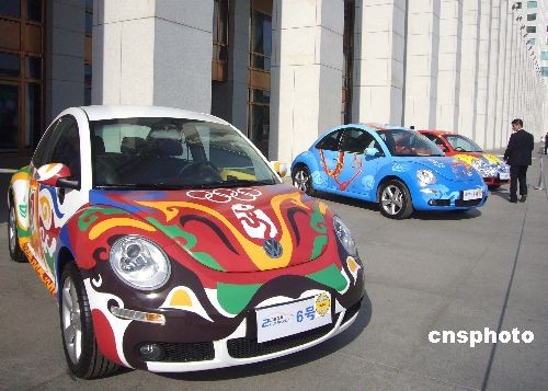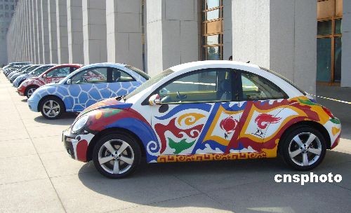 11月7日,八輛大眾奧運(yùn)版甲殼蟲彩繪車在北京奧林匹克中心進(jìn)行最后展示,甲殼蟲車身上的彩繪設(shè)計包括了水立方、旗袍、印花藍(lán)布等。并將于11月8日下午通過二度車網(wǎng)“同步拍”向全世界進(jìn)行網(wǎng)絡(luò)拍賣。中新社發(fā) 玉龍 攝