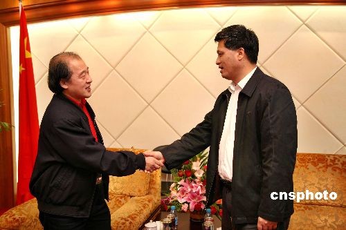 全國政協(xié)委員、中國航天科技集團(tuán)公司黨組書記馬興瑞(右)代表全體航天人向畫作《騰飛》作者、著名畫家王書平教授表示感謝。