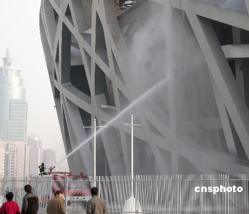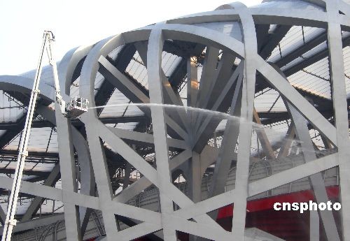 11月14日, 國家體育場“鳥巢”的鋼結(jié)構(gòu)迎來了北京奧運會結(jié)束后的第一次全面清洗。負責此次清洗任務的奧林匹克中心區(qū)消防支隊出動了兩輛消防車及68米的云梯,使用高壓水槍進行清洗作業(yè)。預計整個“鳥巢”的清洗工作大約需要1周的時間。中新社發(fā) 玉龍 攝
