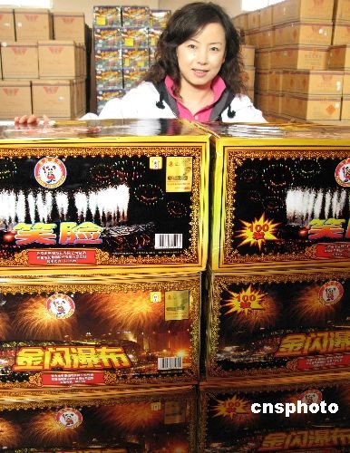 十一月十六日,北京市民期待的牛年春節(jié)花炮品種--“鳥巢”系列煙花進(jìn)入京城,將在節(jié)日市場(chǎng)現(xiàn)身。首批進(jìn)京的煙花爆竹近六千箱,包括“笑臉”、“七色彩虹”、“祥云”等,幾乎是北京奧運(yùn)開幕式煙花造型的翻版。另有一些奧運(yùn)品種、約三十萬箱的煙花也將陸續(xù)運(yùn)抵北京。據(jù)熊貓煙花有限公司總經(jīng)理潘笛介紹,這些奧運(yùn)煙花的翻版市場(chǎng)銷售價(jià)格普通市民均能接受,它們都有防偽標(biāo)志。中新社發(fā) 任海霞 攝