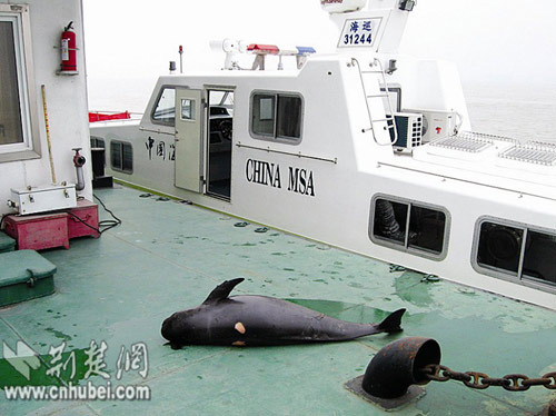 昨日中午,武漢海事局執(zhí)法人員在長(zhǎng)江龍口水道巡航時(shí),發(fā)現(xiàn)一具江豚的尸體。嘉魚(yú)縣漁政局技術(shù)人員趕來(lái),經(jīng)鑒定,該江豚體長(zhǎng)1.45米,重約60公斤,身上有明顯的捕魚(yú)器具傷痕,是致其死亡的直接原因。