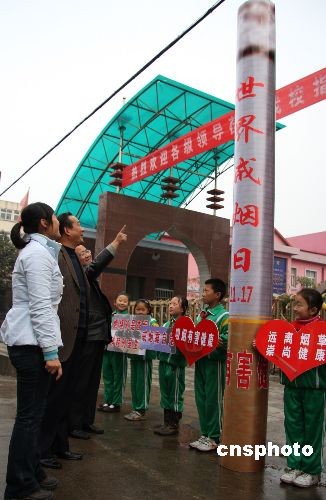 11月17日,小學(xué)生制作的巨無霸“香煙”引來過往市民好奇的目光。當(dāng)日是“世界戒煙日”,山東棗莊市回民小學(xué)學(xué)生用舊報紙和卡紙等制作了一支3.6米高的巨無霸“香煙”模型,豎立在學(xué)校大門旁,并組成戒煙小分隊,勸告煙民戒煙。中新社發(fā) 吉 喆 攝