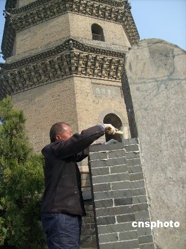 圖為工人正在小心翼翼地為塔前石碑建設碑樓。