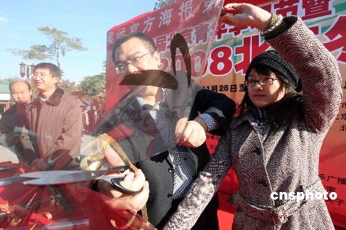 北京奧運(yùn)會(huì)官方海報(bào)第一版底版銷毀儀式在北京地壇書市舉行。