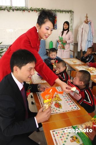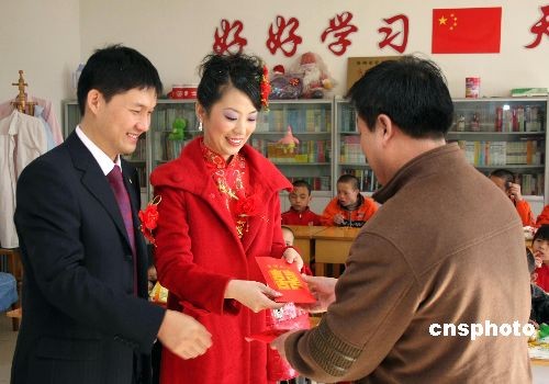 11月29日,身在廣東公安系統(tǒng)工作的梁智、王文星兩位新婚警察夫婦在河北滄州老家舉辦婚禮,他們決定把親友送的婚禮紅包禮金15888元分別捐獻給四川地震災區(qū)和滄州市福利保障院的智障兒童。結婚典禮結束后,這對新婚夫婦驅車前往福利院看望兒童,并向當?shù)孛裾块T捐獻了自己的結婚紅包禮金。中新社發(fā) 楊志濤 攝