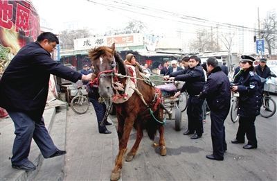 11月29日,一女商販駕馬車與城管“角力”。當(dāng)日9時許,這名賣橘子的女商販與同伴被宣武城管廣外分隊查獲。女商販趁人不備坐上馬車,一抖韁繩命令拉車黃馬躥向周圍圍觀的人群。幸有便衣工作人員(左)與城管死死拉住,才未釀出大禍。(周民 袁國禮)