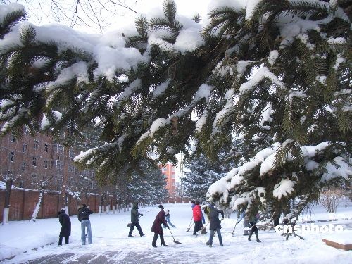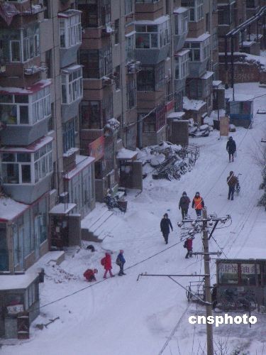 2008年12月4日,齊齊哈爾市再次降雪,城市銀裝素裹。當(dāng)?shù)貧庀笈_(tái)發(fā)布藍(lán)色寒潮預(yù)警信號(hào),提醒市民做好預(yù)防寒潮準(zhǔn)備。齊齊哈爾市已經(jīng)連續(xù)兩天降雪,降雪給城市交通帶來了不便,車輛紛紛緩行,市民忙著清掃道路上的積雪。中新社發(fā) 王云龍 攝