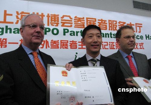 12月5日,中國2010年上海世博會首批境外參展者完成主體登記,獲頒證照。此舉標志著上海世博會面向全球的參展服務(wù)啟動。圖為荷蘭展區(qū)總代表魏偉勵(左一)、盧森堡展區(qū)副總代表費瑞朋(右一)等從上海官員手中接過營業(yè)執(zhí)照等。中新社發(fā) 許曉青 攝