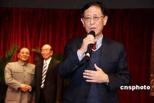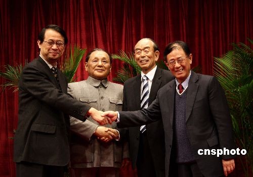 12月5日,中國人民和平外交促進會、炎黃子孫熱愛祖國聯(lián)合會、中國偉人蠟像館等,在北京人民廣播電臺大廈啟動“平福中日,世代之約”活動。中國人民和平外交促進會會長胡德平、日本國大使館公使泉裕泰參加了活動;顒觾x式上,中國人民向日本人民贈送了一份特殊意義的禮物——以蠟像藝術(shù)形式再現(xiàn)30年前鄧小平和福田赳夫簽訂“中日和平友好條約”的歷史時刻。中新社發(fā) 張愛東 攝