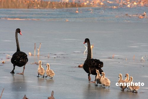 12月14日,北京圓明園,一對(duì)黑天鵝夫婦帶著8只未滿月的天鵝寶寶在享受著北京冬日溫暖的陽(yáng)光。據(jù)介紹,8只小黑天鵝是11月22日出生。中新社發(fā) 鄭雄增 攝