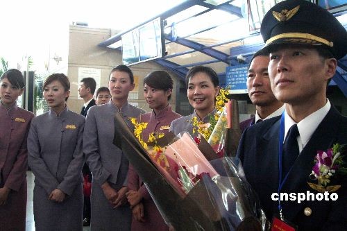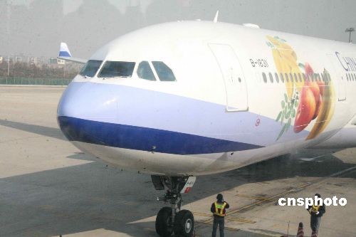 臺灣地區(qū)中華航空的CI七九八九越過海峽,于十二月十五日十點(diǎn)十分飛抵浙江杭州蕭山機(jī)場。機(jī)身上印著臺灣的水果。中新社發(fā) 汪恩民 攝