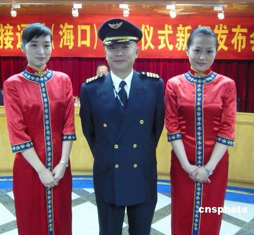 十二月二十日,?-臺(tái)北將首開(kāi)直航航線。海南航空為順利完成此次首航,特別推出精干的機(jī)組人員。機(jī)長(zhǎng)蒲明(中)曾執(zhí)飛2005年兩岸春節(jié)包機(jī)最后一個(gè)航班。乘務(wù)長(zhǎng)和頭等艙乘務(wù)員在去年以來(lái)都曾執(zhí)飛過(guò)兩岸中秋、春節(jié)包機(jī)。中新社發(fā) 王辛莉 攝