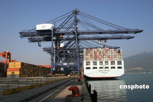 十二月十九日,深圳鹽田國(guó)際集裝箱碼頭首次迎來(lái)兩岸大三通后的直航集裝箱船舶──“中遠(yuǎn)大洋州”號(hào),它在十八日駛離臺(tái)灣高雄港后,經(jīng)過(guò)十四小時(shí)的航行抵達(dá)鹽田!爸羞h(yuǎn)太平洋”號(hào)運(yùn)載力為一萬(wàn)二十標(biāo)箱,在鹽田靠泊約八小時(shí)。鹽田是兩岸七十四個(gè)直航港口之一。中新社發(fā) 方衛(wèi) 攝