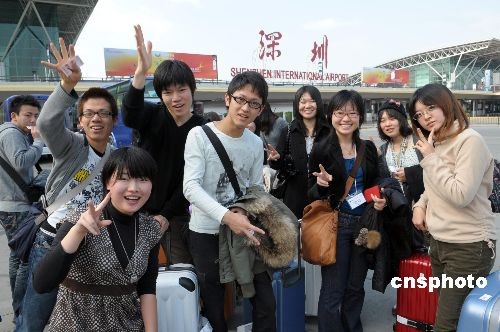 十二月二十一日,日本青少年世代友好代表團(tuán)一行百余人抵達(dá)深圳,他們將前往紅樹林、錦繡中華、民俗文化村、深圳大學(xué)、大族激光等處參觀。圖為日本大學(xué)生抵達(dá)深圳機(jī)場時(shí)高興地合影留念。中新社發(fā) 陳文 攝