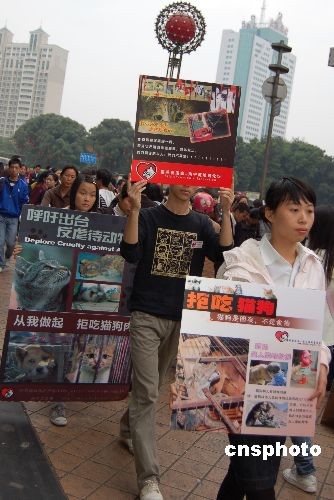 12月21日,廣西南寧部分愛貓人士在街頭舉牌宣傳,號(hào)召民眾“拒吃貓、狗肉”,并呼吁官方出臺(tái)反虐待動(dòng)物法。中新社發(fā) 劉萬強(qiáng) 攝