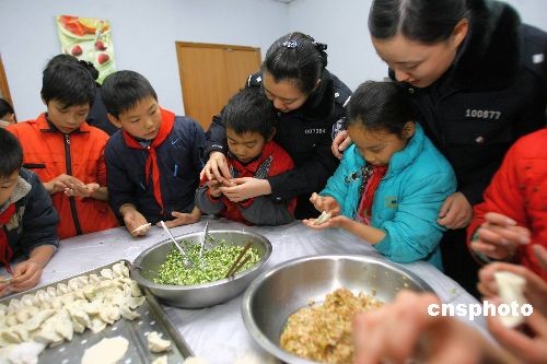 12月21日,中國(guó)農(nóng)歷“冬至”,中國(guó)北方地區(qū)有冬至吃餃子、吃餛飩的習(xí)俗。鄭州女警把在當(dāng)?shù)匦W(xué)讀書的四川地震災(zāi)區(qū)孩子接到警營(yíng)一起包餃子,歡度這一傳統(tǒng)節(jié)氣,并帶他們參觀警營(yíng)。中新社發(fā) 慎重 攝