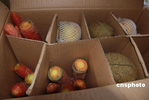 12月23日,贈(zèng)臺(tái)大熊貓“團(tuán)團(tuán)”、“圓圓”離開雅安碧峰峽前往成都雙流國(guó)際機(jī)場(chǎng)。臺(tái)灣人民期盼已久的“團(tuán)團(tuán)”、“圓圓”,終于踏上了赴“寶島”臺(tái)灣之路。圖為大熊貓途中所用食物。中新社發(fā) 陳學(xué)梅 攝