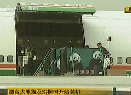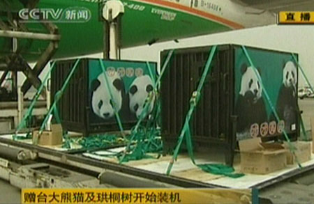 發(fā)表評(píng)論  贈(zèng)臺(tái)大熊貓“團(tuán)團(tuán)”、“圓圓”23日飛赴臺(tái)灣。大陸有關(guān)部門在成都雙流機(jī)場(chǎng)舉辦“贈(zèng)臺(tái)大熊貓及珙桐樹赴臺(tái)歡送儀式”,目前儀式已結(jié)束,開始裝運(yùn)大熊貓和珙桐樹。