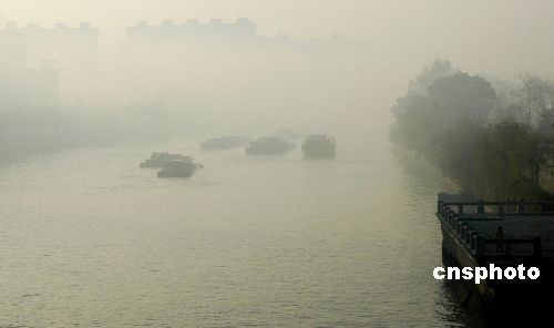 12月25日早上6時56分,杭州市氣象臺發(fā)布大霧黃色氣象預(yù)警,從早上7時起,濱江區(qū)、錢塘江兩岸及部分城區(qū)出現(xiàn)能見度小于500米的濃霧,對交通出行帶來一定影響。圖為在京杭大運河杭州段,濃霧中列隊通行的船只。中新社發(fā) 金斌 攝