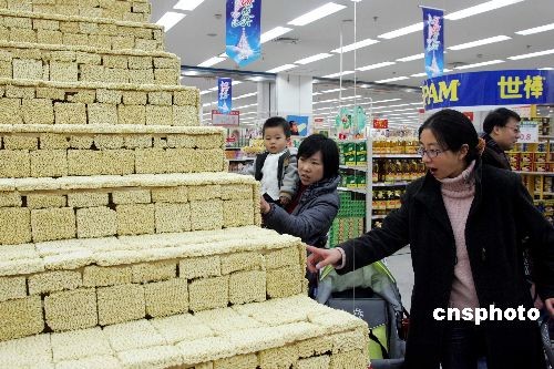 圖為由方便面搭建而成的樓梯。