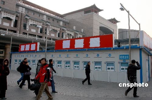 12月26日,北京西站廣場上搭建起“臨時售票窗口”,為2009年春運(yùn)做準(zhǔn)備。2009年春運(yùn)將從元月11日至明年2月19日結(jié)束,為期40天。今年春運(yùn)的特點(diǎn)是學(xué)生流和民工流探親流三流重疊,春運(yùn)壓力空前集中。針對近日來迅猛增長的節(jié)前客流,為方便旅客購票,春運(yùn)期間北京站和西站會將在站前廣場開辟臨時售票窗口,方便旅客購票。中新社發(fā) 鄭雄增 攝
