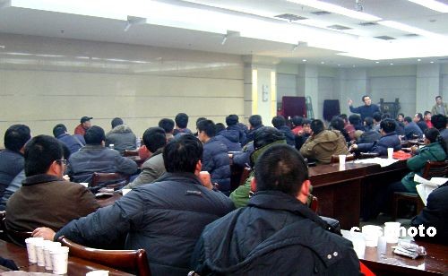 12月26日下午3時許,三鹿液態(tài)奶山東經(jīng)銷商聚集石家莊市三鹿集團總部討要貨款,在得知此次石家莊市政府新出臺的還款方案并未涉及山東液態(tài)奶經(jīng)銷商后,百余經(jīng)銷商情急之下登至三鹿集團五層高的辦公樓樓頂,直至當(dāng)?shù)靥鼐鰟,將?jīng)銷商們勸下樓頂,事態(tài)才得以控制,整個過程持續(xù)近一小時。圖為山東經(jīng)銷商被請進會議室后,與三鹿集團有關(guān)負(fù)責(zé)人就還款事宜進行協(xié)商。中新社發(fā) 牛琳 攝