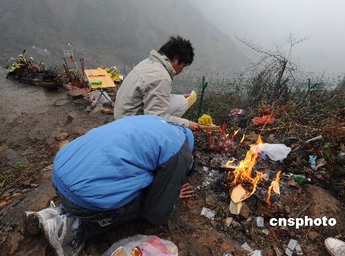 幾位北川中學(xué)的幸存學(xué)生2009年即將畢業(yè),他們?cè)谛履旯?jié)假日來到北川縣城廢墟外的望鄉(xiāng)臺(tái),遙祭被四川大地震摧毀的北川中學(xué)上千名遇難師生和親人們。中新社發(fā) 賈國榮 攝