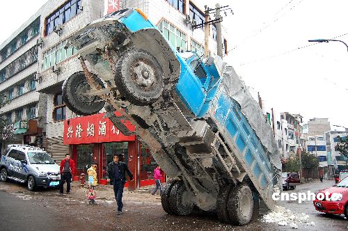1月7日,貴州省福泉市一輛嚴(yán)重超載的汽車(chē)在某道路倒車(chē)時(shí)因后箱貨物較重將汽車(chē)“壓趴”,汽車(chē)前身高高翹起,所幸未造成人員傷亡。 中新社發(fā) 楊榮 攝